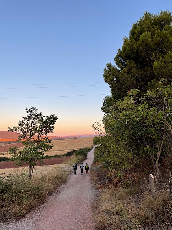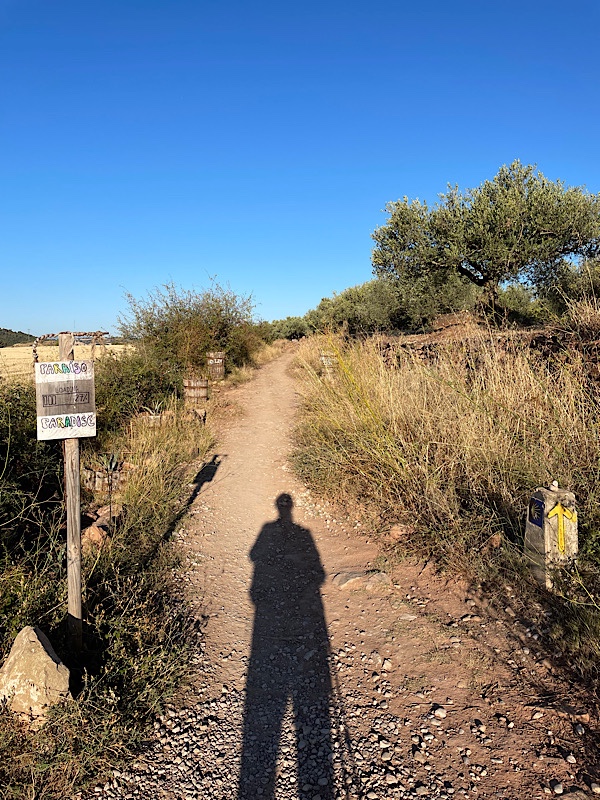 It was a truly gorgeous day outside, full of sunshine. I walked through rolling hills full of agricultural fields and small vineyards. At one point, I walked past this “rest stop” that some kind people had built into the side of the trail, full of old chairs and tables. I let my feet air out here, and put a blister patch on a small blister that had been forming on the side of my right foot below my big toe. Good thing I did – by the time I got to Estella 8 miles later, the blister had ballooned to the size of a euro cent coin. Somehow, though, the blister didn’t bother me too much the rest of the way, and I had a lovely time just walking steadily and listening to the playlist my friends have made for me. And, as soon as I got to the hostel and cleaned up, I got horizontal for a few hours and napped – a delightful way to pass the afternoon! Lunch was a fabulous salad from the Casa Carmen; dinner was grocery store carbonara and protein pudding, plus half a baguette eaten in bed before falling asleep.