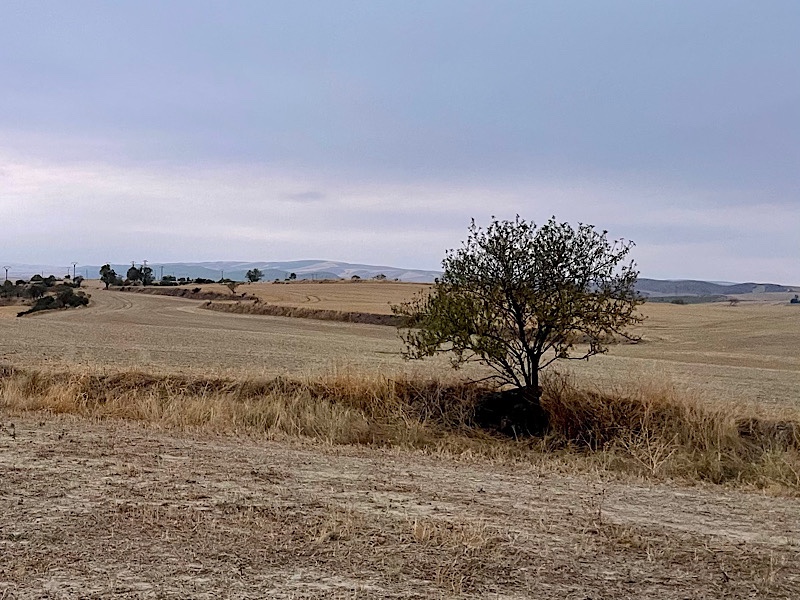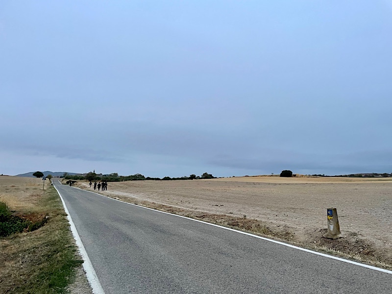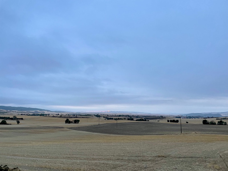 This was the longest day yet on the trail, and it was a tough one — especially from miles 5 through 10, when the trail just felt unending. The morning started off well. I began walking before sunrise, so I got to see the fields light up around me as I headed west. Nearly five miles into the day, I arrived in Sansol, where I stopped for some fresh OJ, a banana and a protein bar. The sun was still rising, and briefly peeked out from behind the clouds to cast a reddish pink hue over the empty wheat fields around the town before popping back behind a possible rainshower. Thankfully, the rain held off until evening, though the day remained gray.