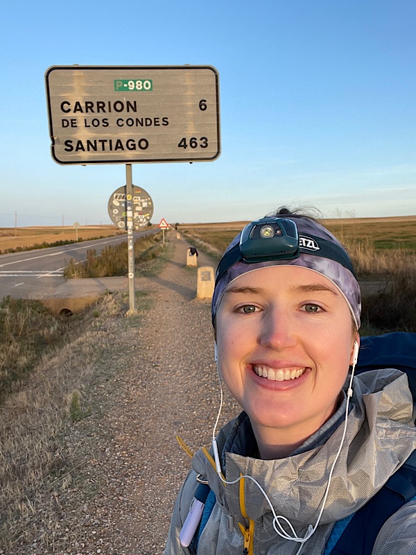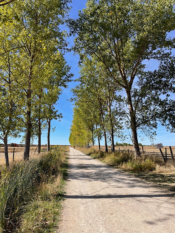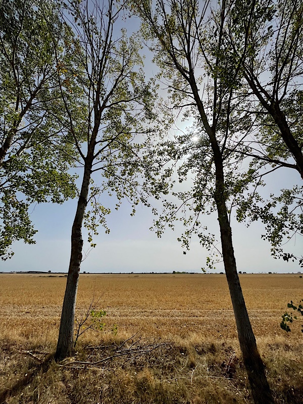 I left my hotel at 6:03am. The Meseta was covered in a blanket of stars — when I turned my headlamp off, I could see the Milky Way, and I caught two or three shooting stars falling over the southwestern sky. It was such a quiet and peaceful morning. My only stop was about ten miles in, in Carrión de los Condes, where I took an hour to fuel up and pick up a knee sleeve at the pharmacy. The knee sleeve made an immediate difference for my tendinitis — while the KT tape was helping, the sleeve definitely goes beyond a placebo effect. I grabbed a breakfast of café con leche and tostadas con aceite y tomate, then realized I needed more food so I stopped at a second bar for a piece of tortilla and a bocadillo (ham and cheese again) to go. After grabbing a new water bottle and two cans of Aquarius for the road, I set on for Calzadilla de la Cueza, which lay 11 miles up the road. The path between the two towns is the longest unsupported stretch of the whole Camino, apparently. I was glad to have a sandwich to eat in the shade of one of the few trees that lined the path. The sun was strong, but my hat, sunglasses and sunblock — plus plenty of water and Aquarius — kept me fairly unbothered.