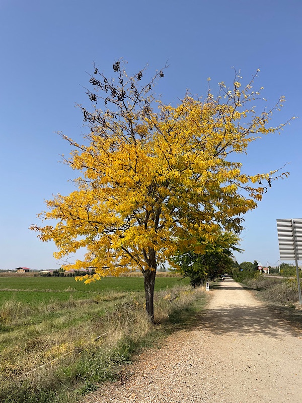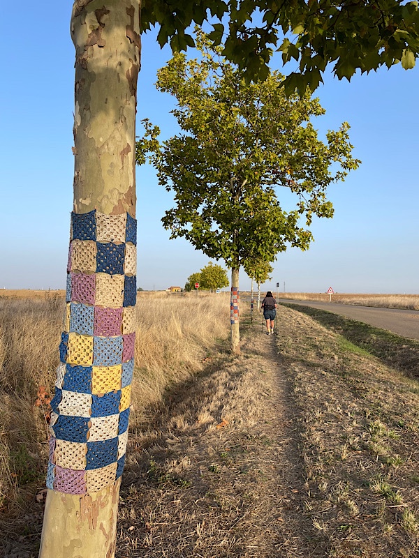 The walk today was delightful in large part due to the trees that had been thoughtfully planted on the southern side of the path. They created small pockets of shade every five meters, making the walk so much more pleasant than the long stretches without any cover. I listened to my Camino playlist, and stopped every few miles for a five minute break on one of the benches that lined the trail. (These benches made a big difference for my legs and my mood. I wouldn’t have stopped as frequently if they hadn’t been there, and the rest breaks made a big difference in my stamina. I hope I see more benches farther west.)