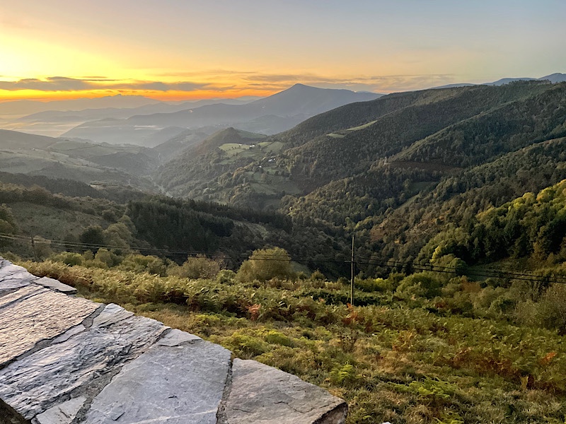 • Watching the sun rise over the mountains behind me from the vista point in O Cebreiro