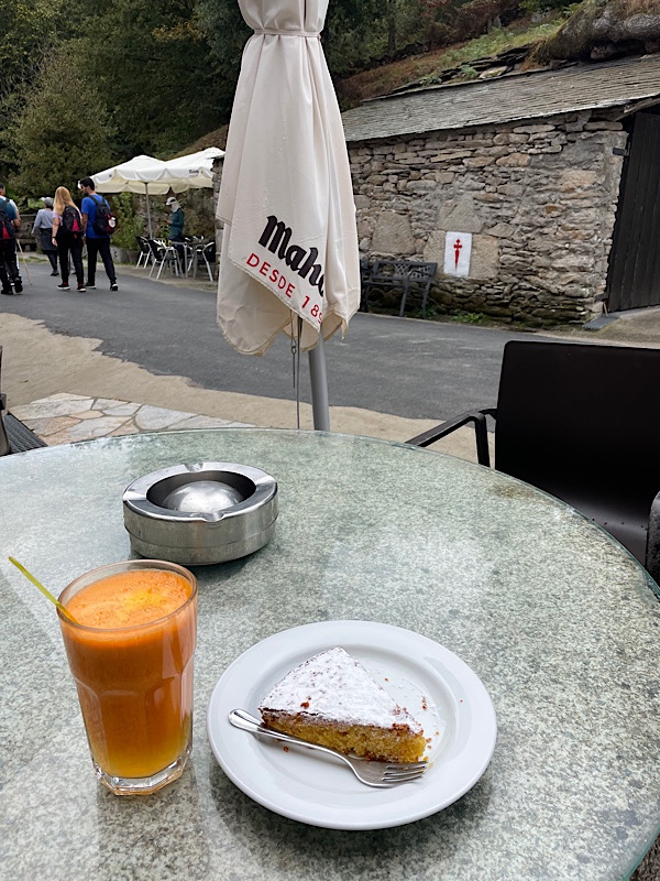- Fresh squeezed juice — a blend of orange, carrot, apple and who knows what else — with a slice of Tarta de Santiago, an almond cake with powdered sugar on top